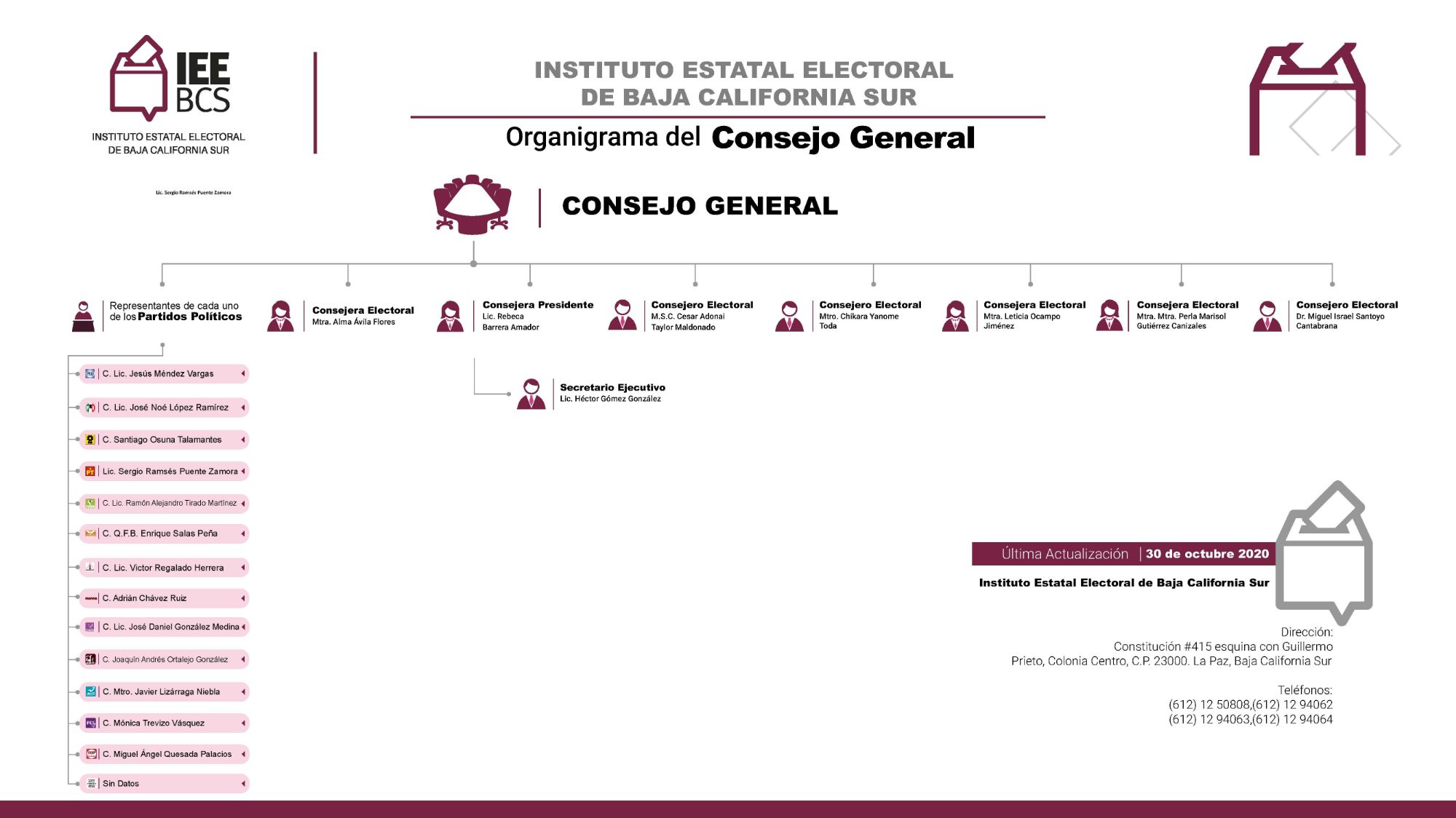 El Instituto Estatal Electoral de Baja California Sur, para el cumplimiento de sus atribuciones, cuenta con un órgano de dirección, órganos técnicos, órganos ejecutivos y órganos desconcentrados, estos últimos funcionan únicamente durante el desarrollo del Proceso Local Electoral.
