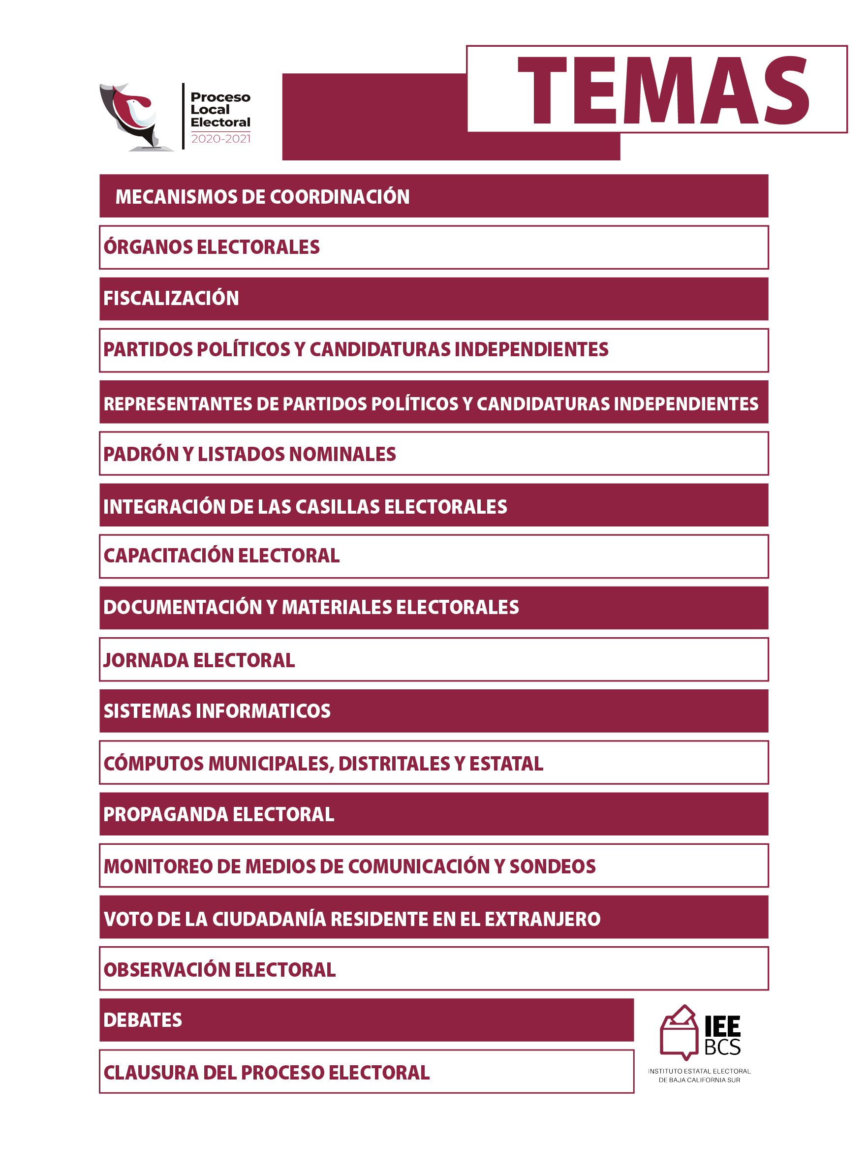 Posteriormente, en el mes de octubre de 2020, mediante firma electrónica, el Instituto Nacional Electoral y el Instituto Estatal Electoral de Baja California Sur celebraron Convenio General de Coordinación y Colaboración con el fin de establecer las bases de coordinación y definir la ejecución de las tareas inherentes a la organización del Proceso Local Electoral 2020-2021 de esta entidad federativa.