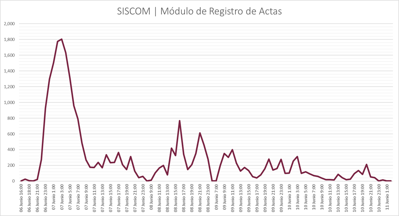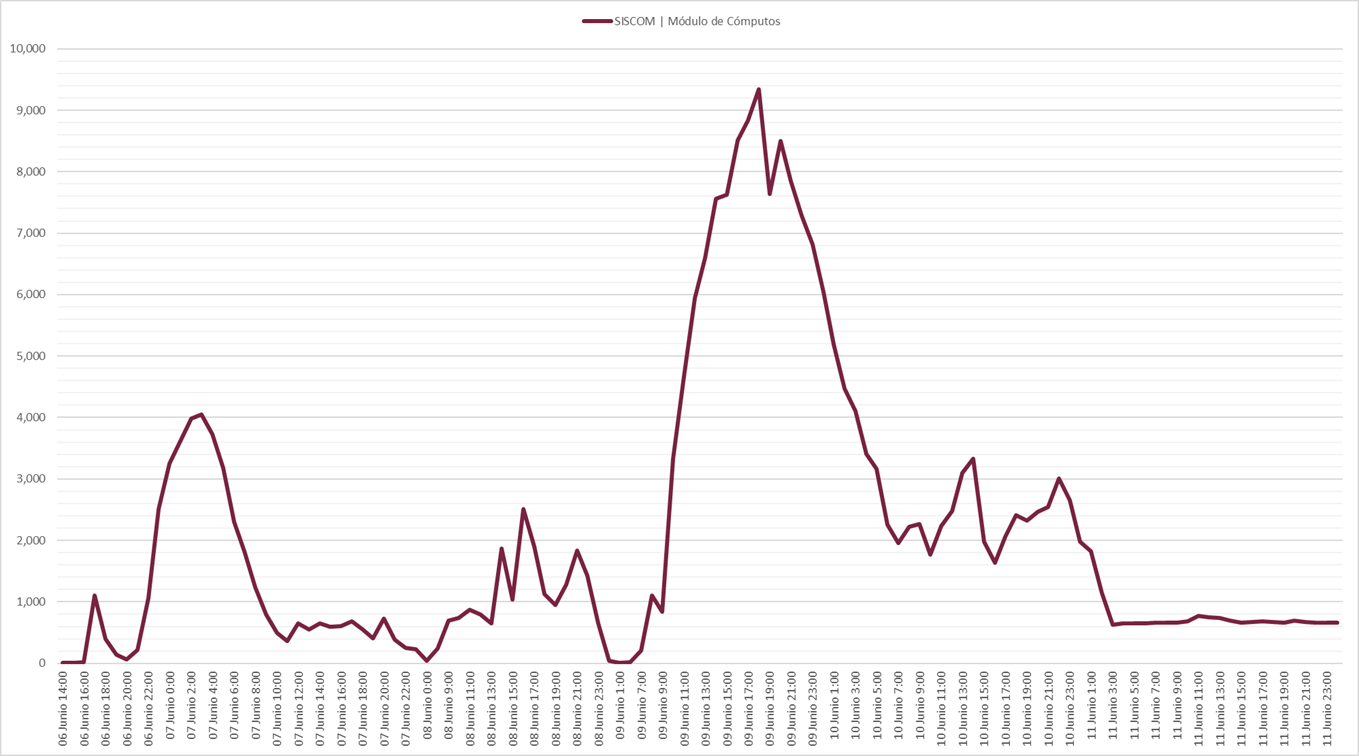 El SISCOM operó en cuatro diferentes momentos: antes de la Jornada Electoral (6 de junio), posterior a la Jornada Electoral (días 6 y 7 de junio), reunión de trabajo y Sesión Extraordinaria (día 8 de junio) y los Cómputos Oficiales (a partir del día 9 al 13 de junio).