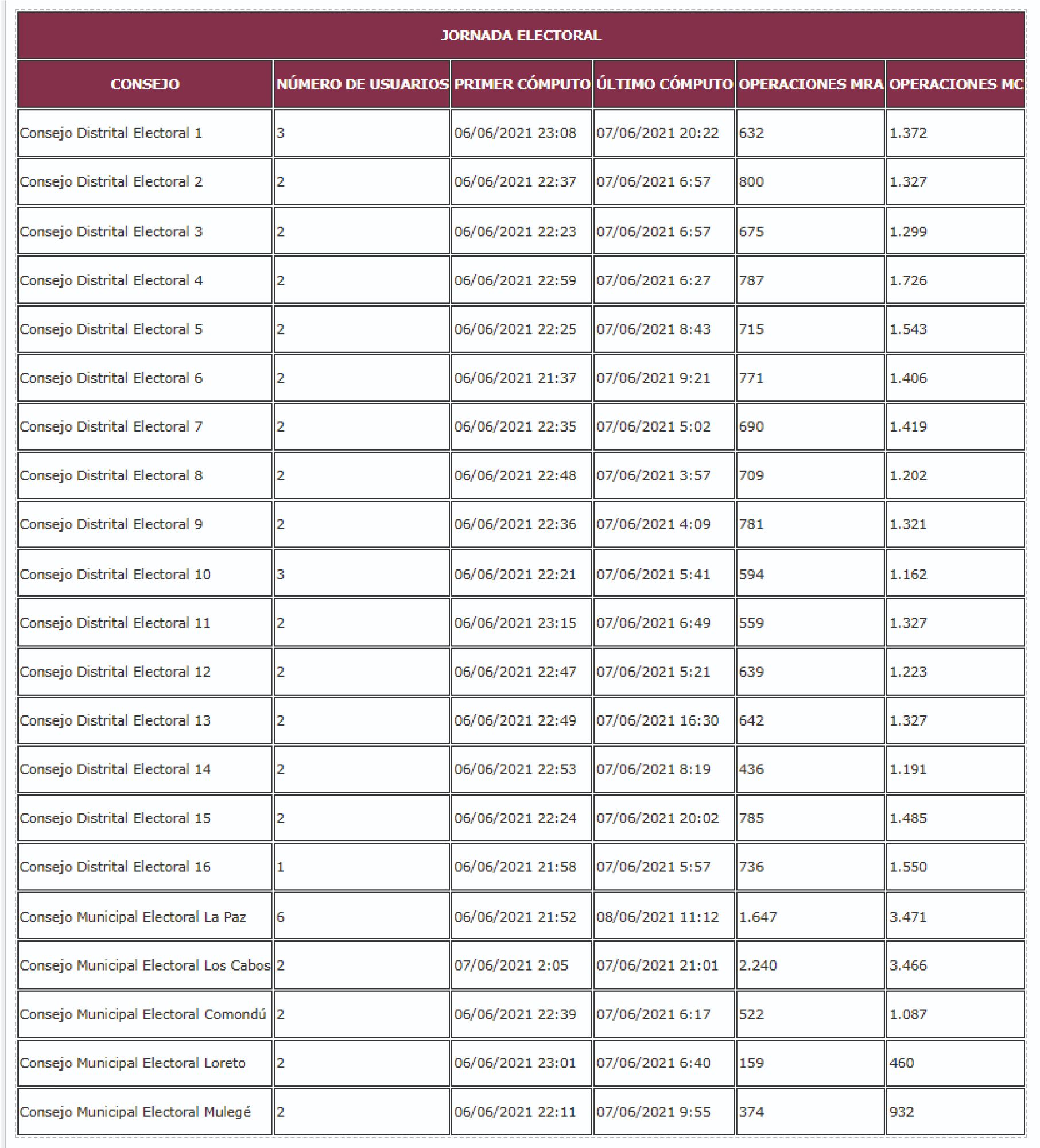 Ya en la etapa de Cómputos Oficiales, los 21 órganos desconcentrados pudieron utilizar el SISCOM sin contratiempos ya que el personal de Oficinas Centrales canalizado a los Consejos Distritales 8, 9, 15, y los Consejos Municipales de La Paz y Los Cabos habían sido capacitadas y capacitados el día martes 8 por la tarde en específico para las actividades que debían de desempeñar en Cómputos Oficiales, y a su vez que se les dio prioridad en atención de dudas y asesorías respecto del uso del SISCOM.