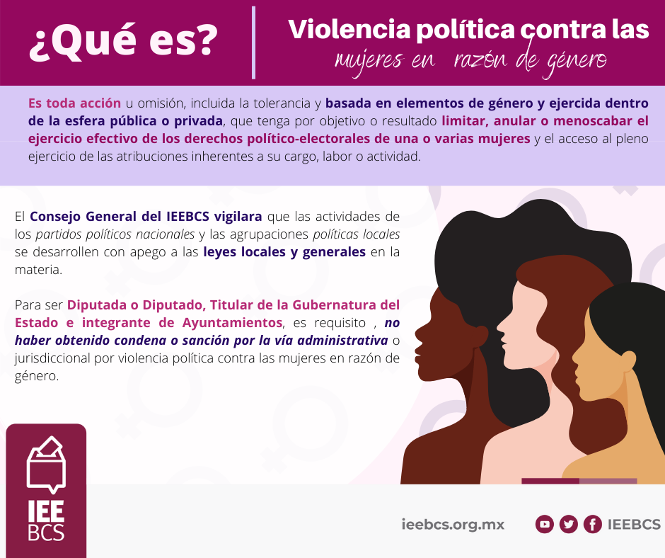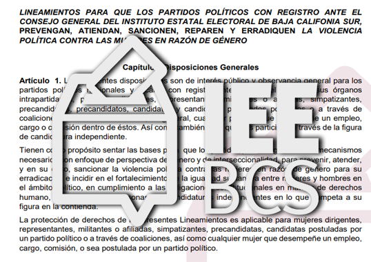 Asimismo, la Ley Electoral del Estado de Baja California Sur en el artículo 12 primer párrafo, establece que el Consejo General de este Instituto tiene la responsabilidad de vigilar el cumplimiento de las disposiciones en material electoral, y a no hacer distinción al ámbito de dichas disposiciones tanto locales como federales, siempre y cuando tengan relación con la materia electoral, por lo que dicho Órgano Superior de Dirección de este Instituto, consideró viable emitir acuerdos y lineamientos para atender y erradicar la Violencia Política contra las Mujeres en Razón de Género, inclusión y paridad entre los géneros, con el objetivo de regular y hacer efectivo el principio de igualdad entre mujeres y hombres, regular y garantizar la igualdad de oportunidades y de trato entre mujeres y hombres que orientaran hacia el cumplimiento de la igualdad sustantiva en los ámbitos público y privado.