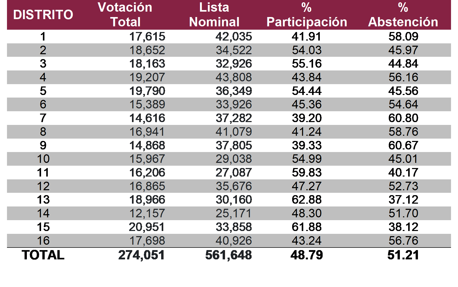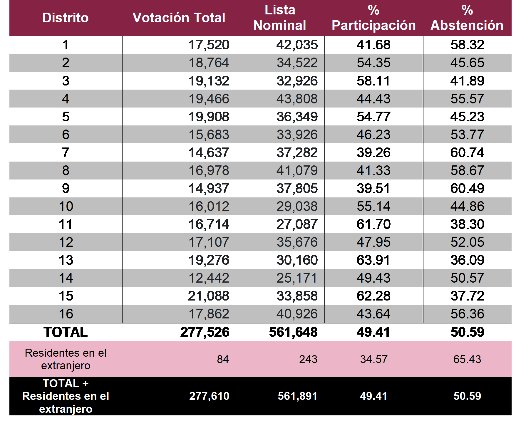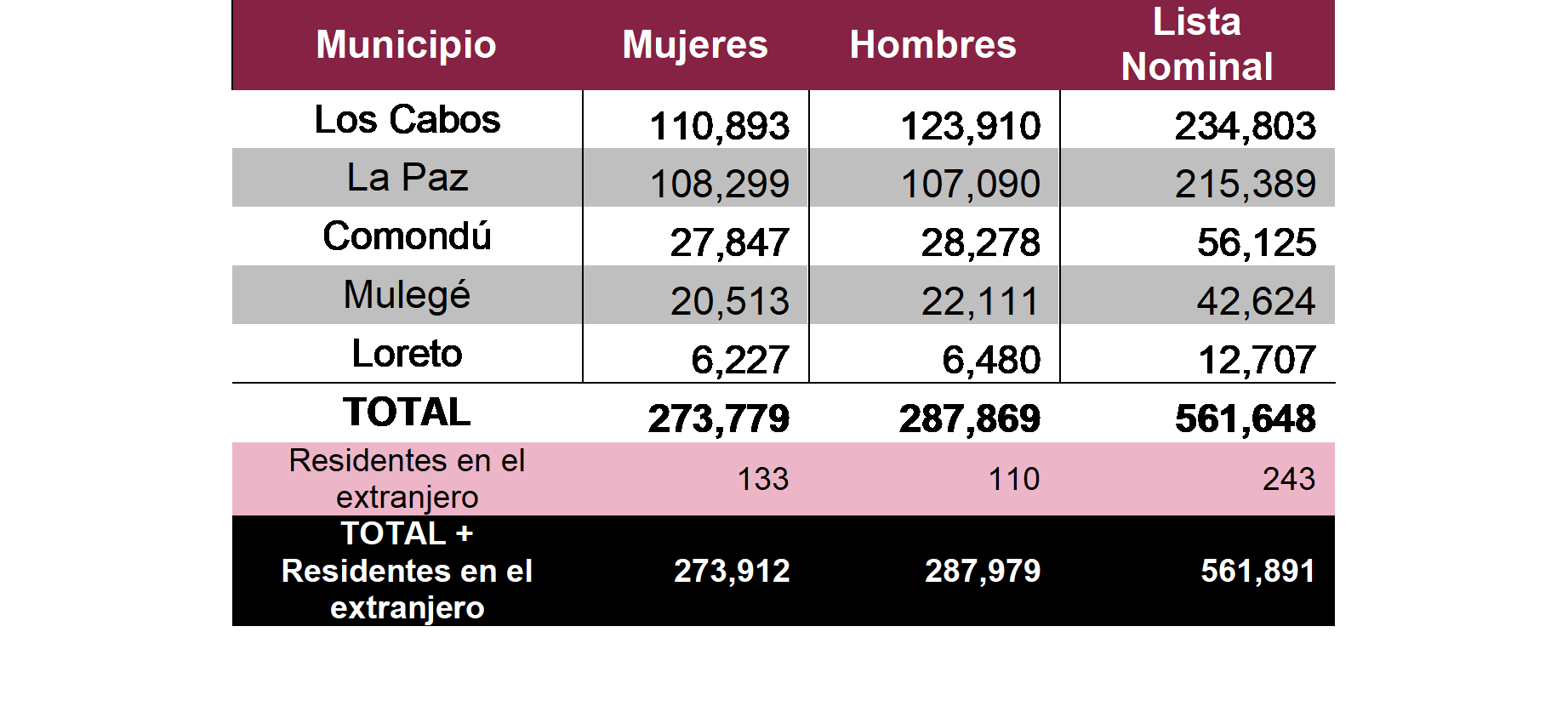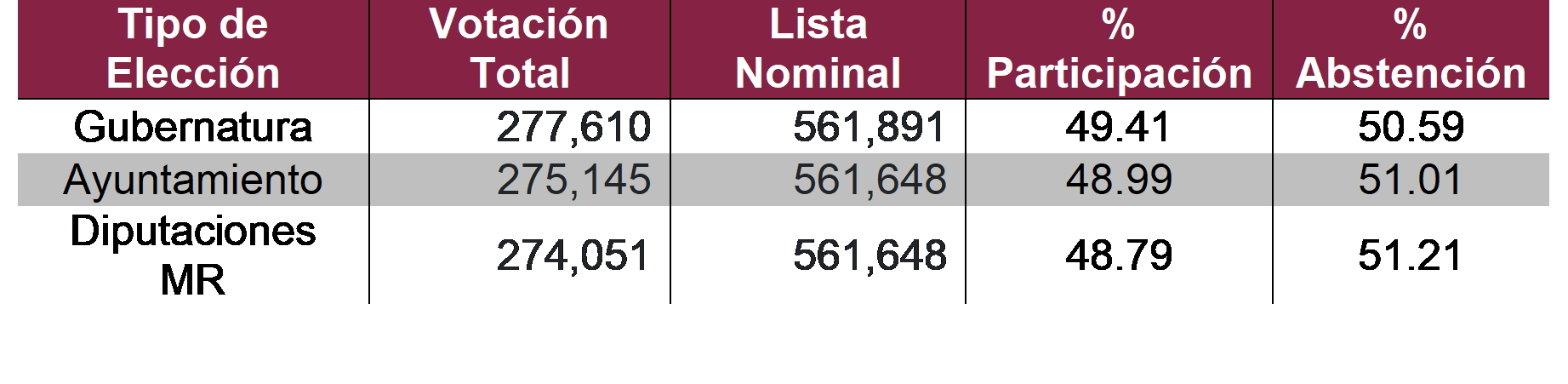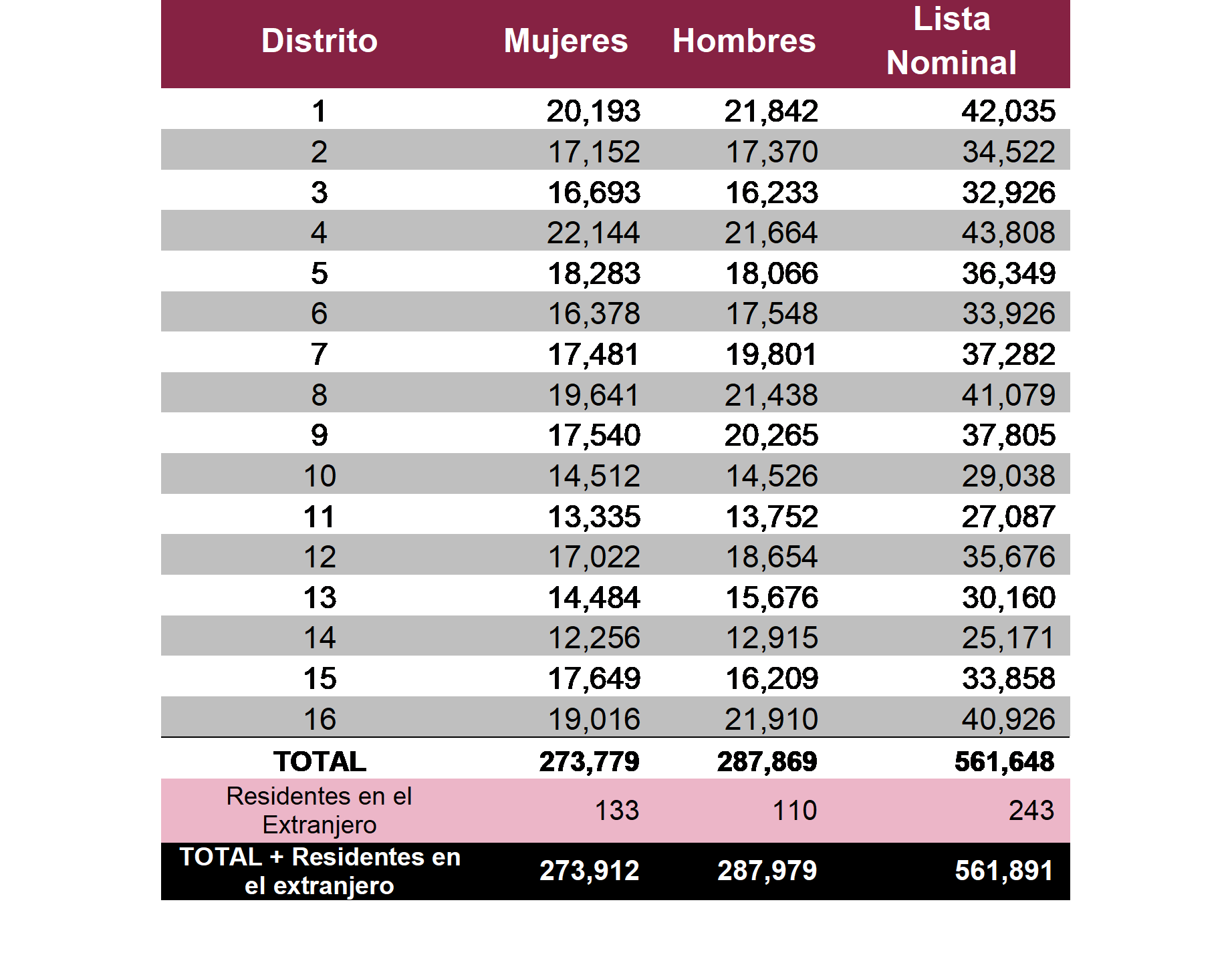 La lista nominal definitiva con corte para las elecciones del 6 de junio de 2021. Cabe destacar que para las elecciones de planillas de ayuntamiento y diputaciones por mayoría relativa la lista nominal comprendió un total de 561,648 ciudadanas y ciudadanos, mientras que para la elección a la gubernatura comprendió 561,891, pues en este caso se considera también a los residentes en el extranjero.