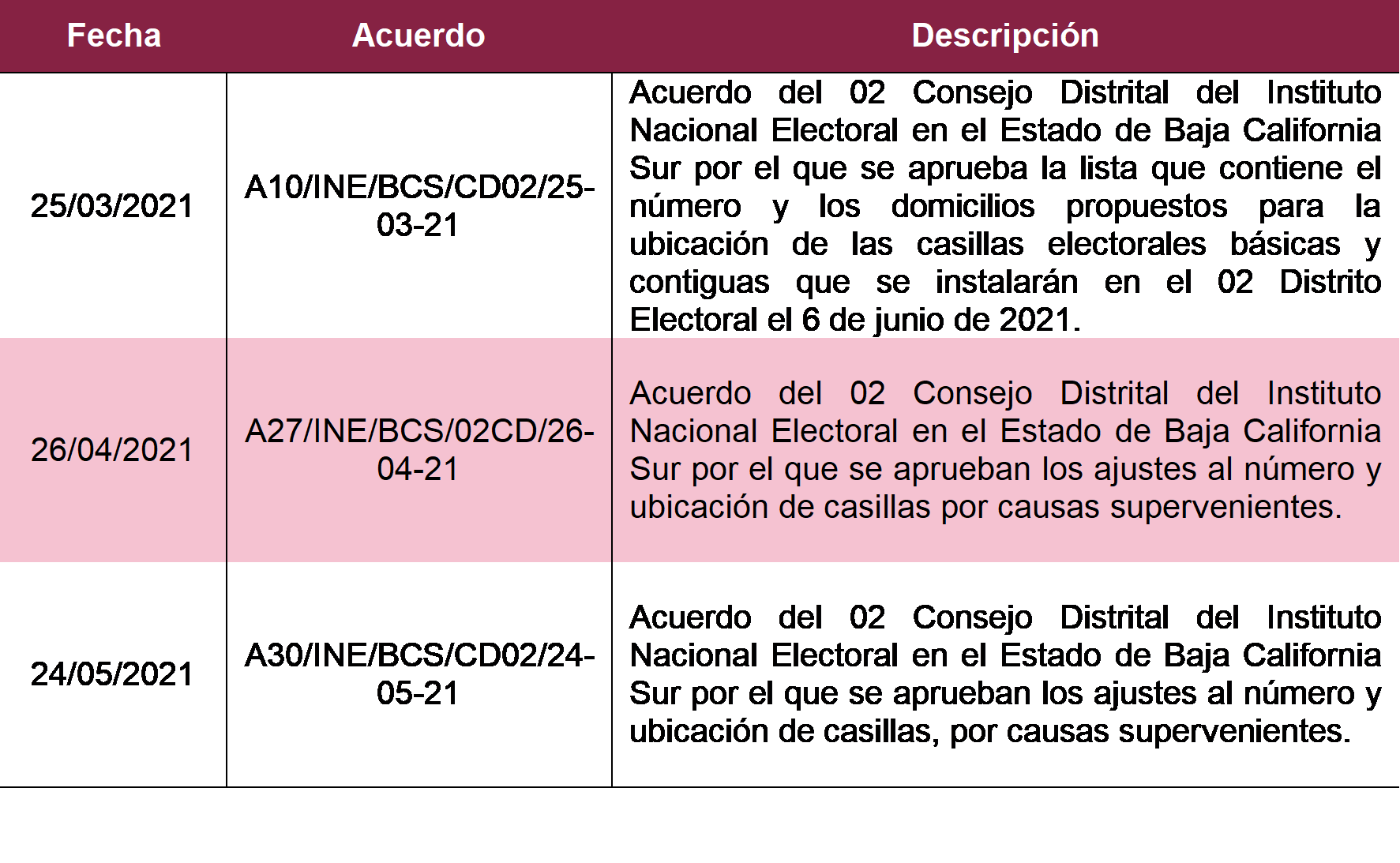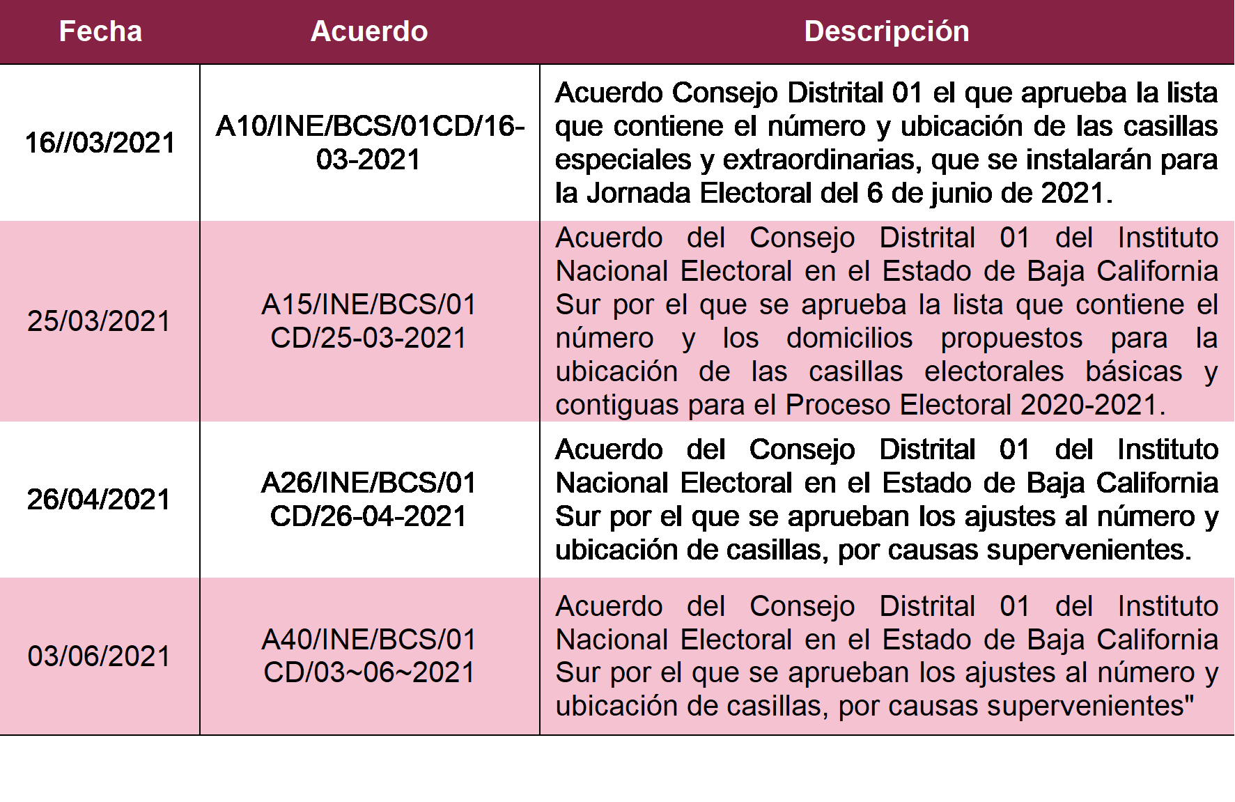 Los acuerdos aprobados de la ubicación de casillas y ajustes correspondientes de las Juntas Distritales Electorales 01 y 02 del INE en Baja California Sur, así como el informe de la DEOE sobre el acompañamiento mencionado.