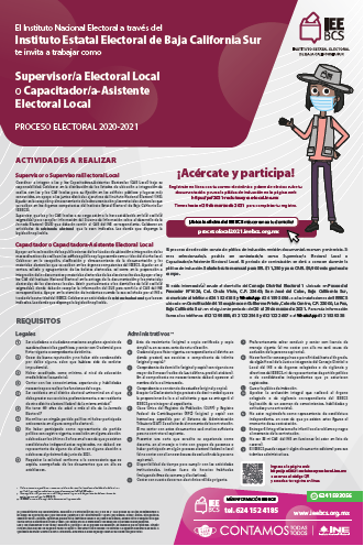✓21 de abril. Capacitación dirigida a las Consejeras y Consejeros Electorales, Secretarias y Secretarios Generales, Enlaces Electorales de los Consejos Distritales Electorales del Instituto Estatal Electoral de Baja California Sur sobre la etapa de Selección, Designación y Contratación para el Procedimiento de Reclutamiento, Selección y Contratación de Supervisores/as Electorales Locales (SE Local) y Capacitadores/as Asistentes Electorales Locales (CAE Local) para el Proceso Local Electoral 2020-2021.