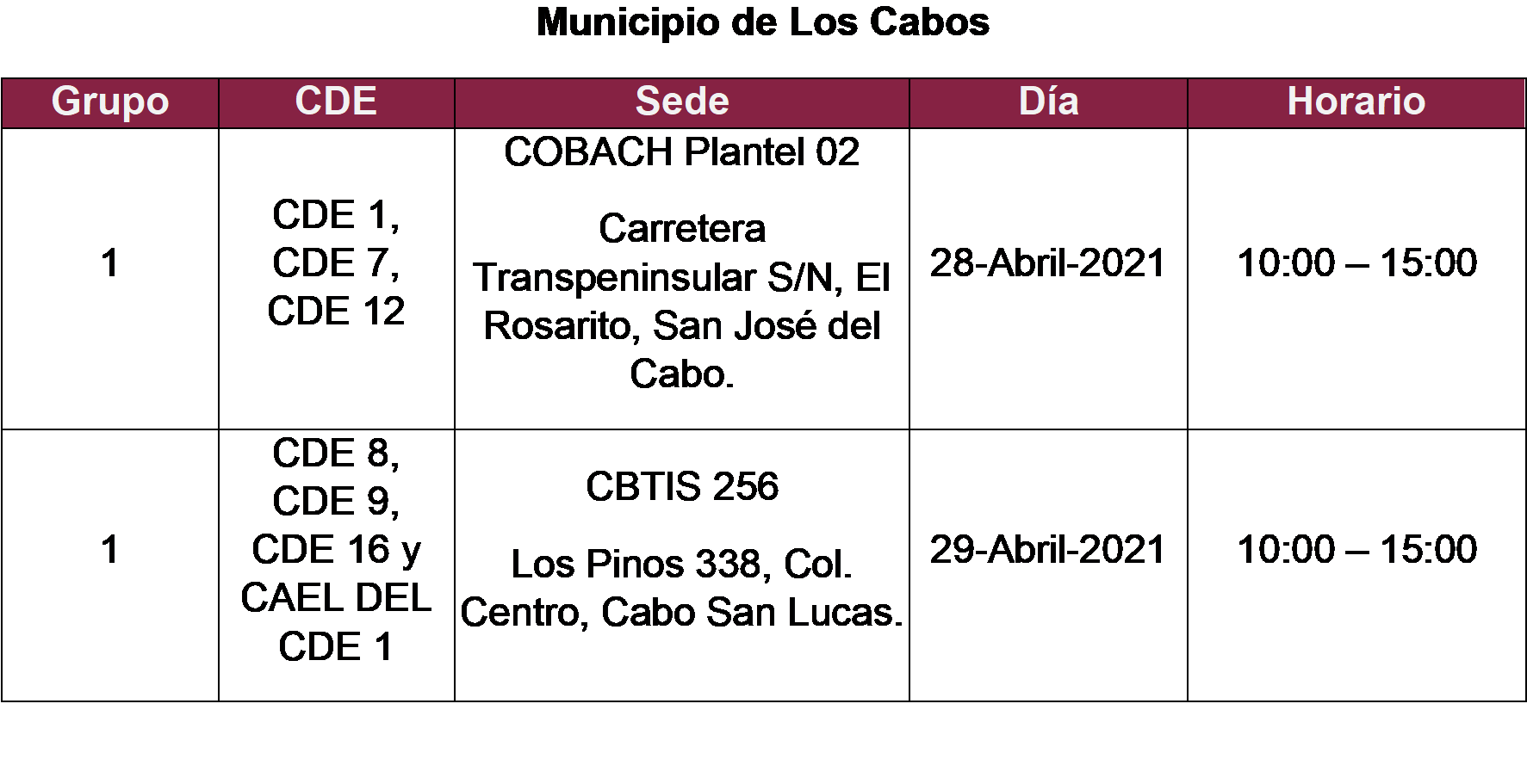 De conformidad con lo establecido en el punto 6 del Anexo 21 "Lineamientos para el Reclutamiento, Selección y Contratación de Supervisores/as Electorales Locales (SE LOCAL) y Capacitadores/as Asistentes Electorales Locales (CAE LOCAL) de la ECAE 2020-2021, se informa que, personal adscrito a esta Dirección Ejecutiva de Educación Cívica y Capacitación Electoral, a saber, impartieron las capacitaciones dirigidas a las y los Supervisores Locales (SEL) y Capacitadores Asistentes Electorales Locales (CAEL) del Municipio La Paz, Los Cabos, Comondú, Loreto y Mulegé, en las sedes de los órganos desconcentrados de este Organismo Público Local, en las fechas, sedes y horarios que se muestran a continuación: