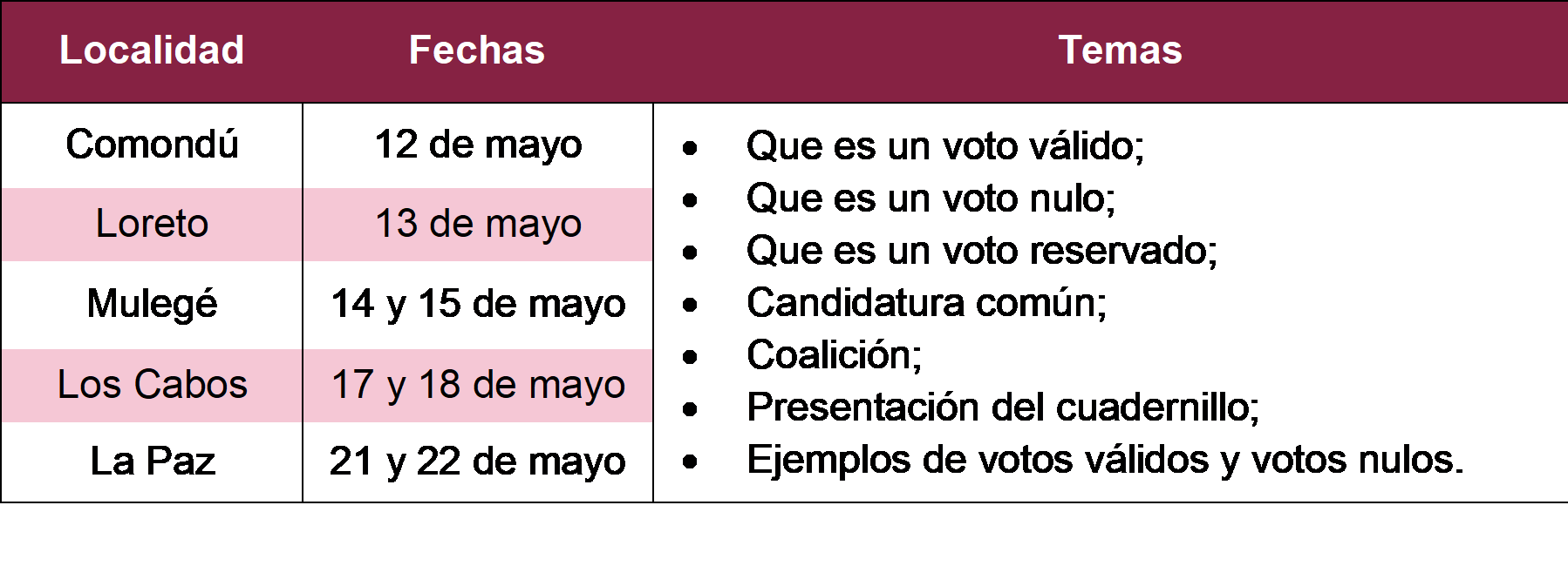 En seguimiento con las actividades propias del Proceso Local Electoral 2020-2021, así mismo con base en los Lineamientos para el desarrollo de las Sesiones de Cómputo de las elecciones locales del Instituto Estatal Electoral de Baja California Sur, se informa que, el Coordinador de Educación Cívica, así como Técnica de Educación Cívica adscritos a la DEECCE, en coordinación con personal de la Dirección Ejecutiva de Organización Electoral de este Instituto, respectivamente, realizaron las capacitaciones a las y los Supervisores/as y Capacitadores/as Electorales Locales, así como a las y los funcionarios integrantes de los órganos desconcentrados de la zona norte, como son Cd. Constitución, Loreto, Santa Rosalía y Guerrero Negro, en cuanto a los temas inherentes al Cuadernillo de Consulta sobre votos válidos y votos nulos, como se muestra: