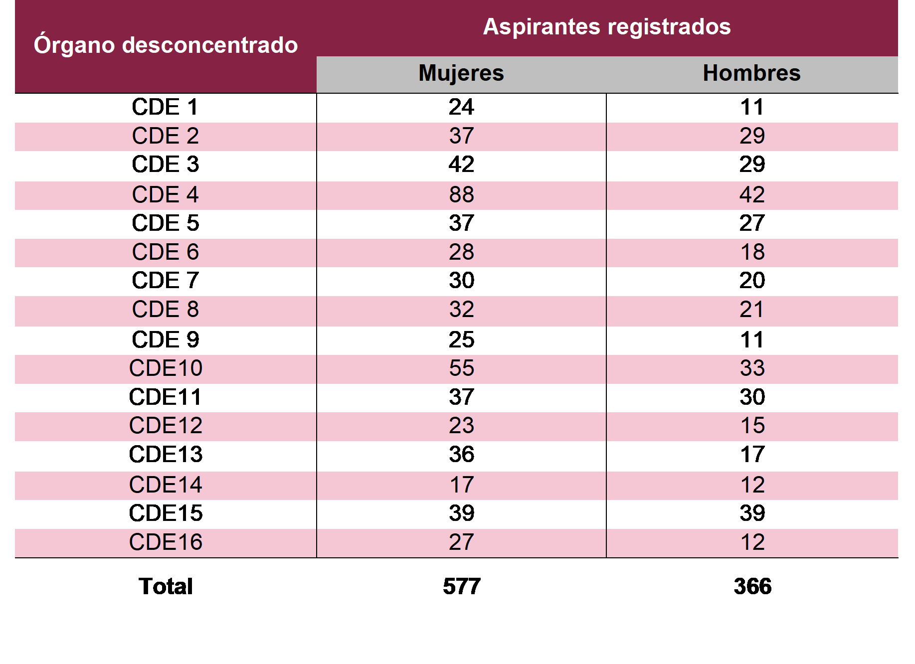 TABLA DE REGISTRO POR CONSEJO DISTRITAL ELECTORAL, POR SEXO