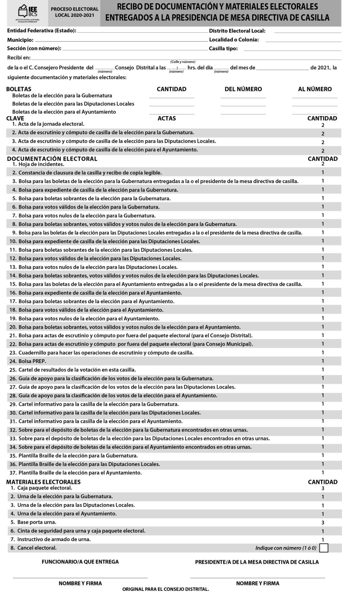 En cumplimiento a lo dispuesto en Ley General de Instituciones y Procedimientos Electorales, así como al Reglamento de Elecciones y en la Ley Electoral del Estado de Baja California Sur, donde se establece la entrega de la documentación y materiales electorales a las presidencias de las mesas directivas de casilla por quienes presiden los consejos competentes del OPL, en este caso a través de las y los Capacitadores Asistentes Electorales Locales cinco días previos a llevarse a cabo la Jornada Electoral, dando un total de 3,106 paquetes entregados a los largo del estado de Baja California Sur. Dentro de esta entrega se encuentra las boletas de las tres elecciones que se llevaron a cabo en Baja california Sur siendo: Gubernatura, ayuntamientos y diputaciones locales, así como bolsas, cuadernillos, cartel, guía, plantilla braille, urnas, caja paquete electoral, instructivo de armado de urna, entre otras.