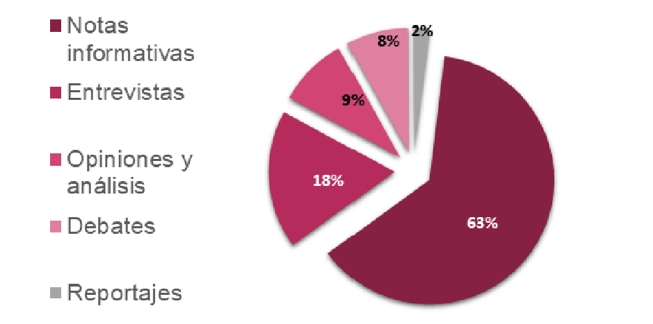 Como se observa la información de la distribución de piezas informativas en televisión, respecto al agregado general, muestra una porción similar. Sin embargo, cuando el análisis se enfoca en la televisión, la proporción si muestra una variación de 8 puntos porcentuales.