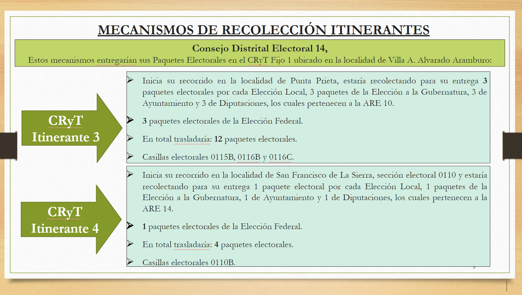 Mecanismo excepcional cuyo objetivo es la recolección de paquetes electorales programados que recorrerá diferentes puntos de una ruta determinada. En caso de aprobarse CRyT Itinerantes, se deberá requerir el acompañamiento de representantes de partidos políticos y candidatos independientes.