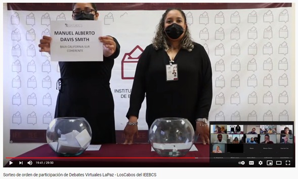 Para el caso de los debates virtuales que se realizaron mediante la plataforma Telmex entre candidatas y candidatos a las Presidencias Municipales de La Paz y Los Cabos, en un evento se realizó el sorteo para ambos, debido a que solo era necesario conocer el orden de participación, obteniéndose el resultado siguiente: