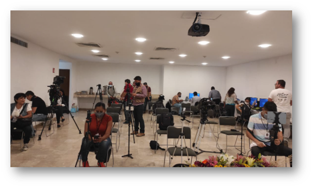 La Jefatura de Comunicación Social inicio con los trabajos de logística para la instalación y funcionamiento de la sala de prensa, considerando las medidas de emitidas por la Secretaria de Salud derivado de la Alerta Sanitaria que se vivía en ese tiempo; se hizo un análisis de las instalaciones para prestar el servicio de sala de prensa, considerando aforo restringido, sana distancia, filtro sanitario, etc., realizando así las gestiones de solicitudes de cotización a espacios que contaran con los requisitos para atender la actividad.