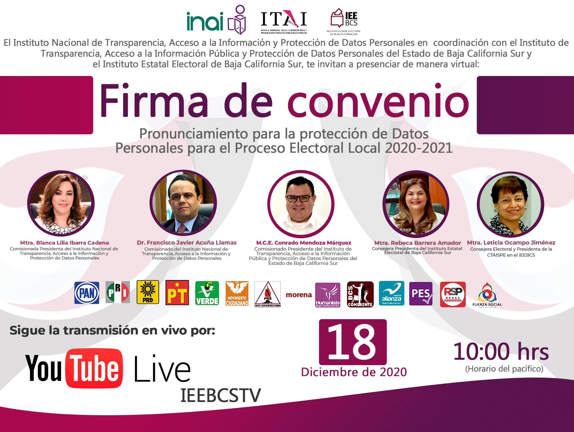 El día 18 de diciembre del 2020, se llevó a cabo la firma de convenio, Pronunciamiento para la protección de datos personales para el Proceso Local Electoral.