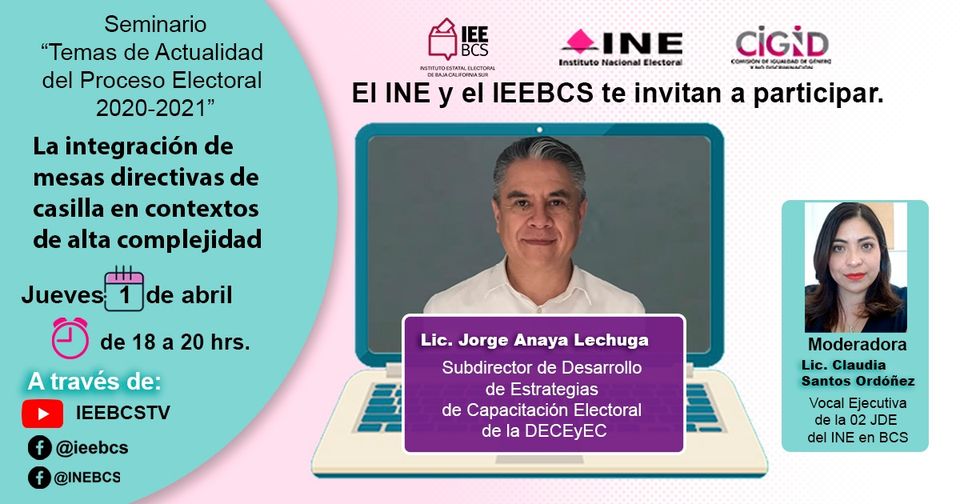 El 17 de abril se presentó dentro del Seminario "Temas de Actualidad del Proceso Electoral 2020-2021" el tema sobre las Competencias de las Autoridades Electorales Federal y Estatal en BCS.