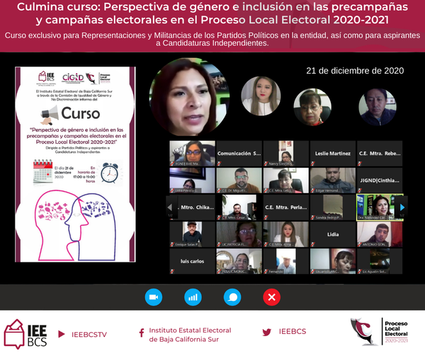 La Comisión de Igualdad de Género y No Discriminación llevó a cabo el curso “Perspectiva de género e inclusión en las precampañas y campañas electorales en el Proceso Local Electoral 2020-2021”, impartido por la Dra. Natividad Cárdenas Morales, el 21 de diciembre del 2020.