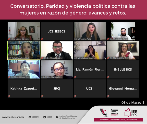 El día 6 de marzo del 2021, en atención a la invitación realizada por el Movimiento de Mujeres del partido NABCS asiste la Consejera Presidenta Rebeca Barrera Amador, al Conversatorio "Violencia de Género", esto en el marco conmemorativo del Día Internacional de las Mujeres.